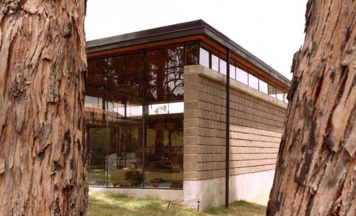 Cette cuisine utilise des murs en blocs de terre comprimée (BTC) pour une ambiance naturelle et écologique, tandis que les structures porteuses, comme les poteaux et les linteaux, sont renforcées en parpaings et béton.